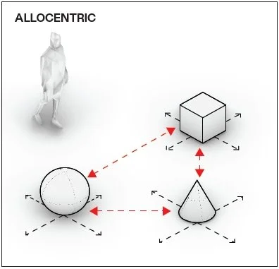 What if we invert the deictic center, and instead of putting the first person at the center of the construct, we put the object at the center, and thus allowing the nonhuman object to construct its own narratives? This conceptual shift will create a third spatial frame of reference, different from the egocentric and allocentric frames of references, both of which are based on human-centric points of view and carry the contextual bias of the time and place in which the narrative is constructed. By contrast, a spatial frame of reference that locates a non-human object as the anchor gives an autonomy to the object, allowing it to construct its own narratives. I call this concept an “isocentric frame of reference.” The object in an isocentric frame of reference has the agency to construct its own deictic center through projections toward the first person’s deictic center. (Figure 1, right) The potential to construct different juxtapositions within each of these projections will allow us to build multiple narratives for the same object, deepening our understanding of it.
