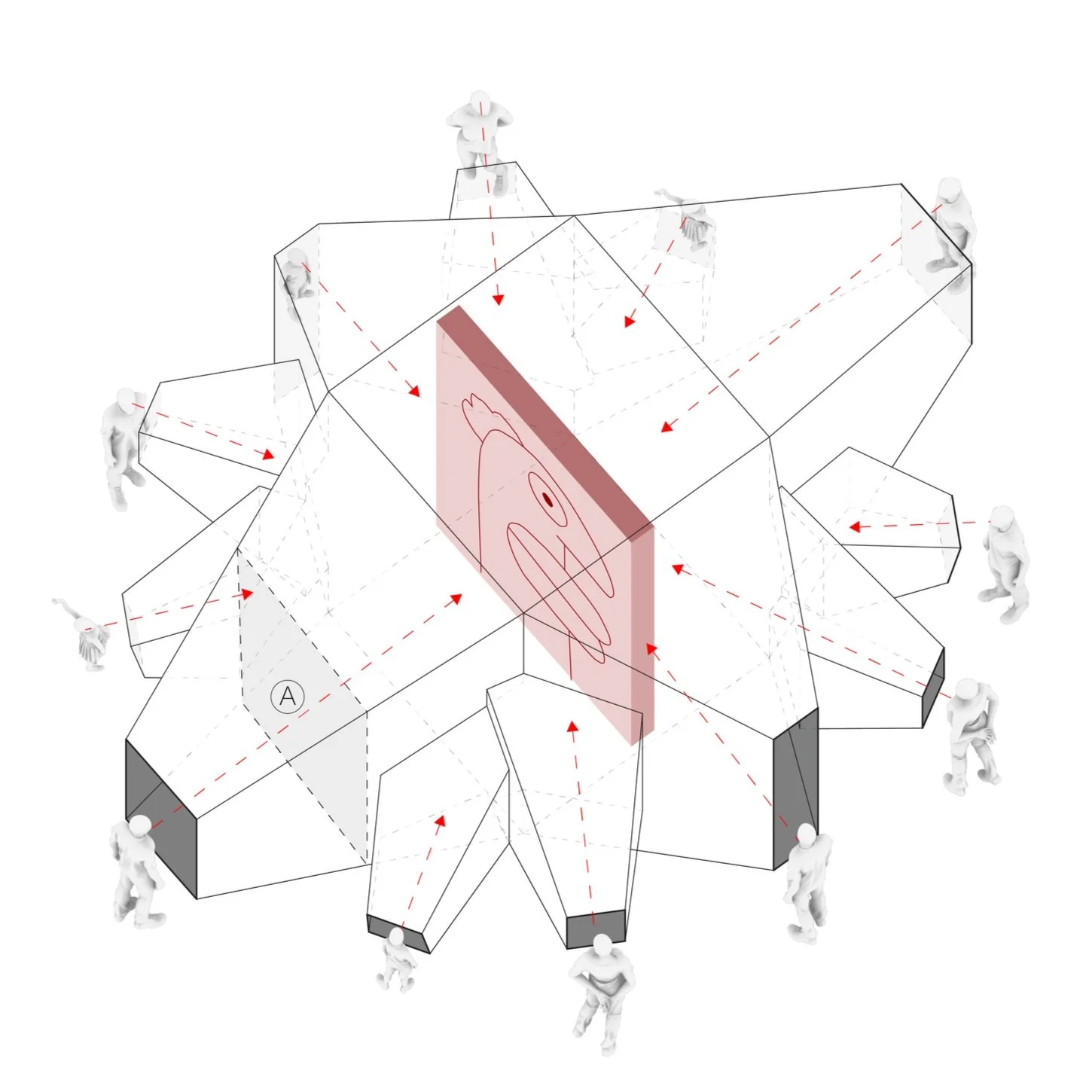 The project creates an oblique volume that intersects the ground, shaping two major planes: the plane of tilt and the plane of balance. The tilted plane defines the floor of the building, as such it becomes the new ground plane. Whereas the horizontal plane, which relates to our land-born canonical position and represents what balance means to us, exists in the project as a juxtaposition of the plane of tilt to remind visitors that they are inside a new P-space. The tilt of the building causes it to sink into the ground plane on one end, which is defined by a reflecting pool, and on the other end it cantilevers over it. The enshrinement space is located below the reflecting pool.