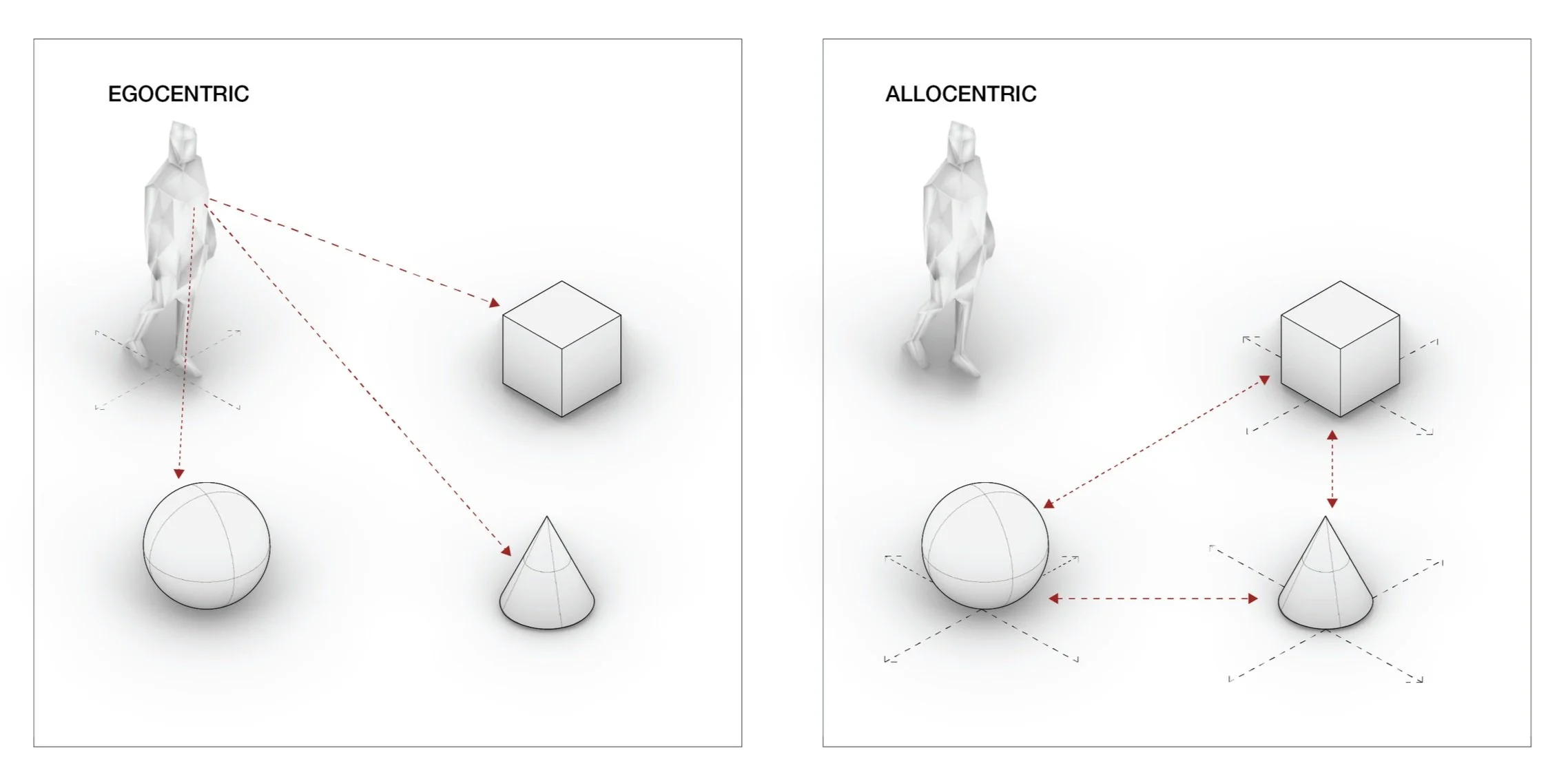 Spatial frames of reference effectively inform of how we define, navigate, and establish relationships in our environment. We are all born into our egocentric frame of reference. As Michel Denis points out: “Each of us, with his/her own egocentric view of the world, interacts with other people who have their respective egocentric views of a shared environment. The question here is that of our capacity to adopt the perspective of other people." (Denis, 2018, p.65) Taking the perspective of other people does not come naturally to us, and it has a cognitive cost. But it is worth it, because, as Denis argues, “by combining together spatial information taken from different viewpoints, people will enjoy the possibility of forming richer representations of their environments." (Denis, 2018, p. 66)